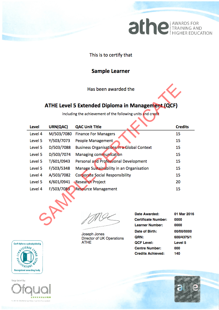 • BA (Hons) Top-up – a progression from ATHE Level 5 Extended Diploma in Management